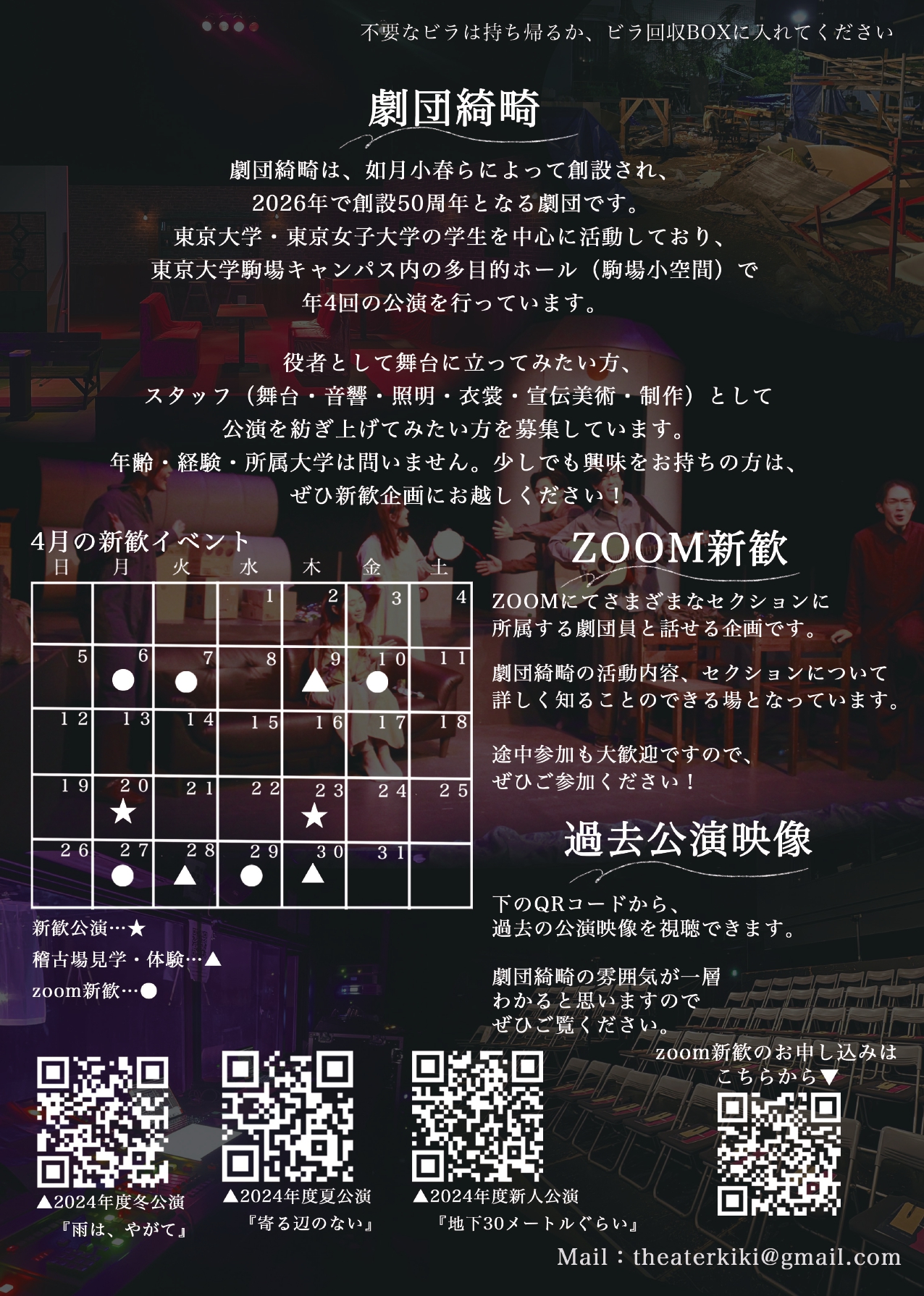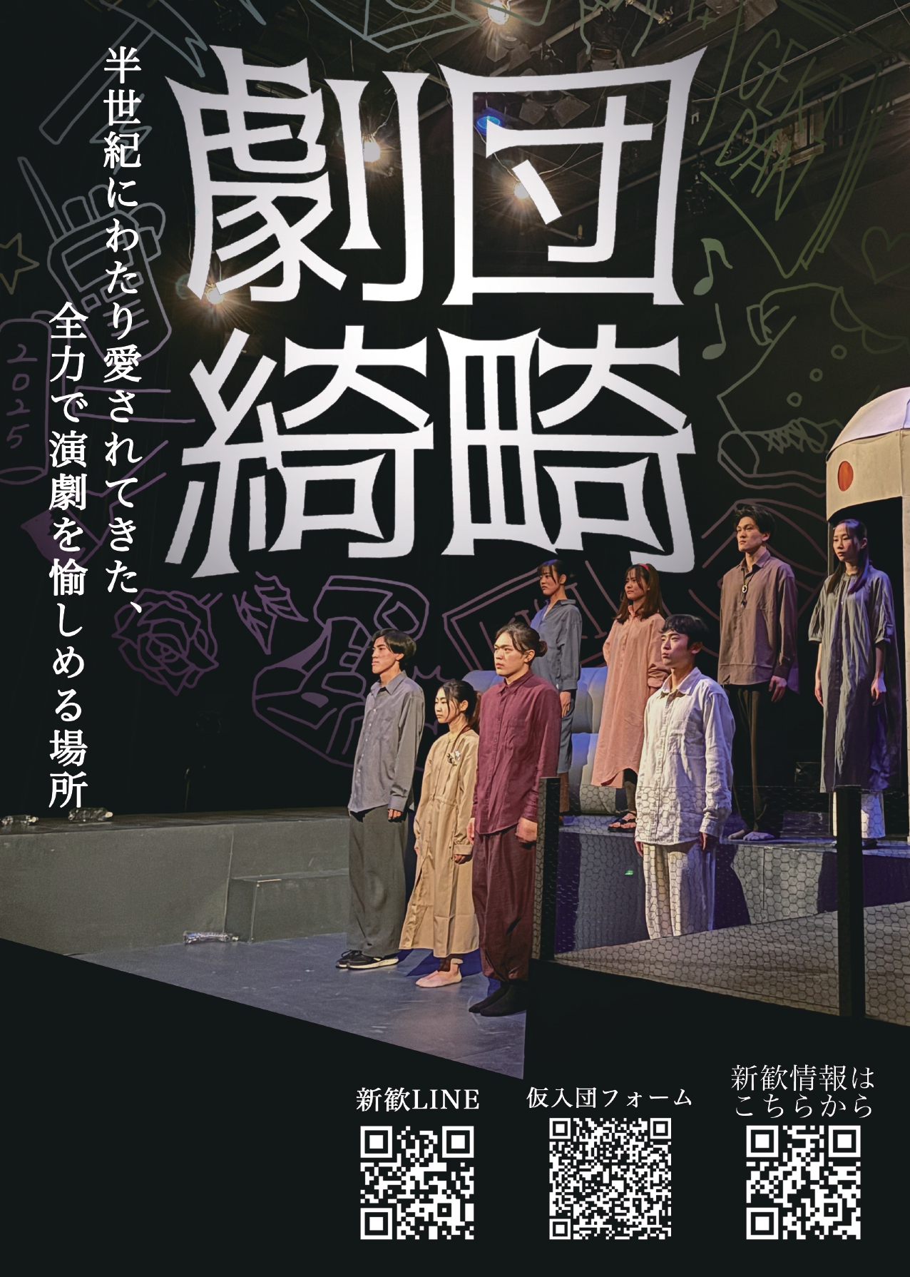 劇団綺畸の主な活動は、夏冬に行う年2回の本公演及び、夏合宿での小規模な公演、一年生のみで行う新人公演です。年齢・経験・大学は不問です。演劇に興味のある方はぜひ以下のオンライン新歓情報をご覧ください!